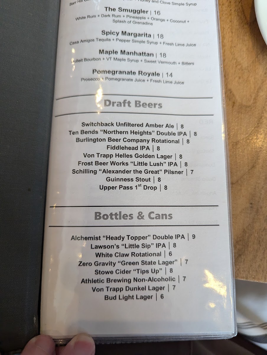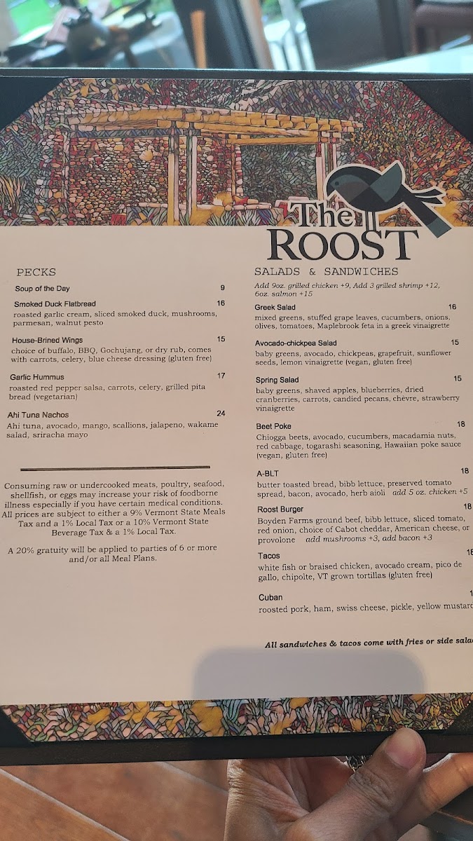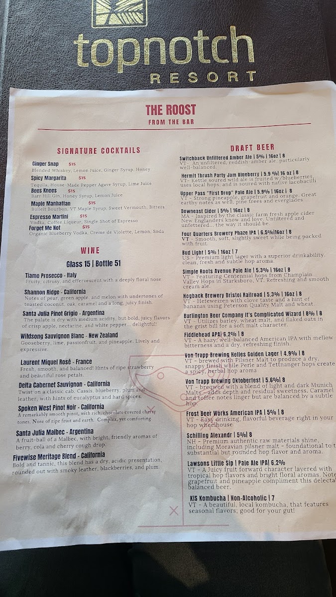 The drink selection features seasonal cocktails like the Honey Bee Martini and a rotating lineup of Vermont craft beers, creating a relaxed mood whether you’re unwinding indoors or enjoying the scenic outdoor dining area. With a blend of familiar comfort foods and elevated flavors, The Roost’s menu fits seamlessly into the unhurried, welcoming vibe of Stowe’s mountain setting, inviting guests to linger and enjoy everyday moments.